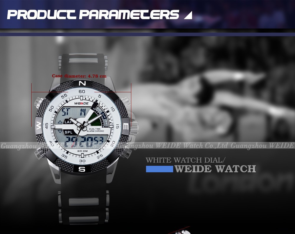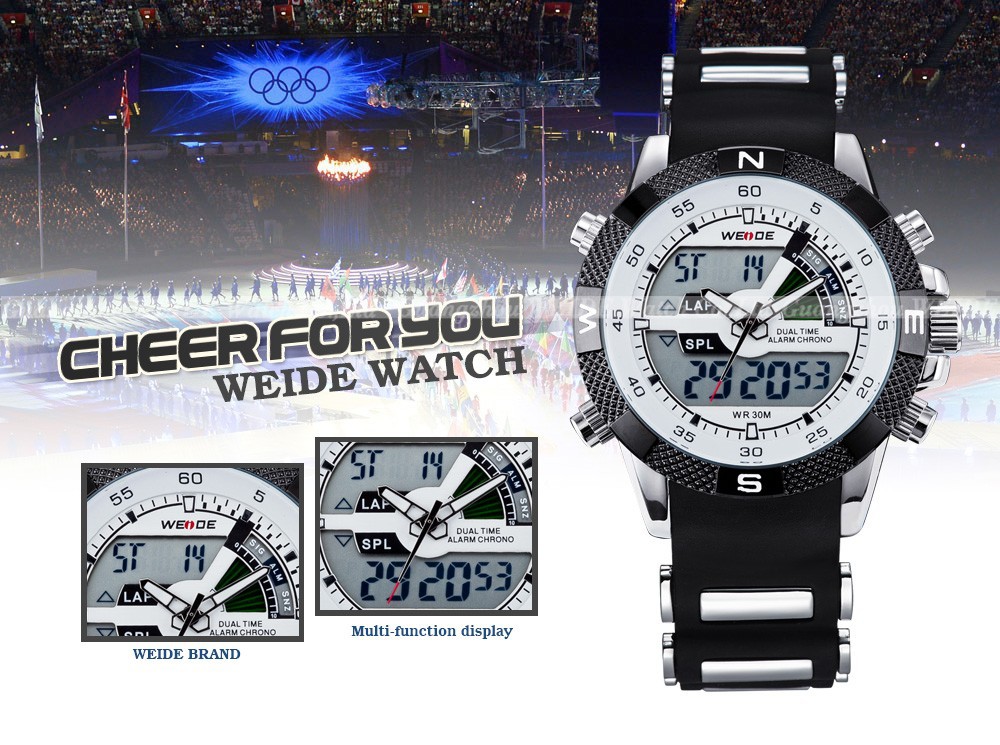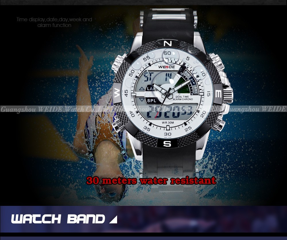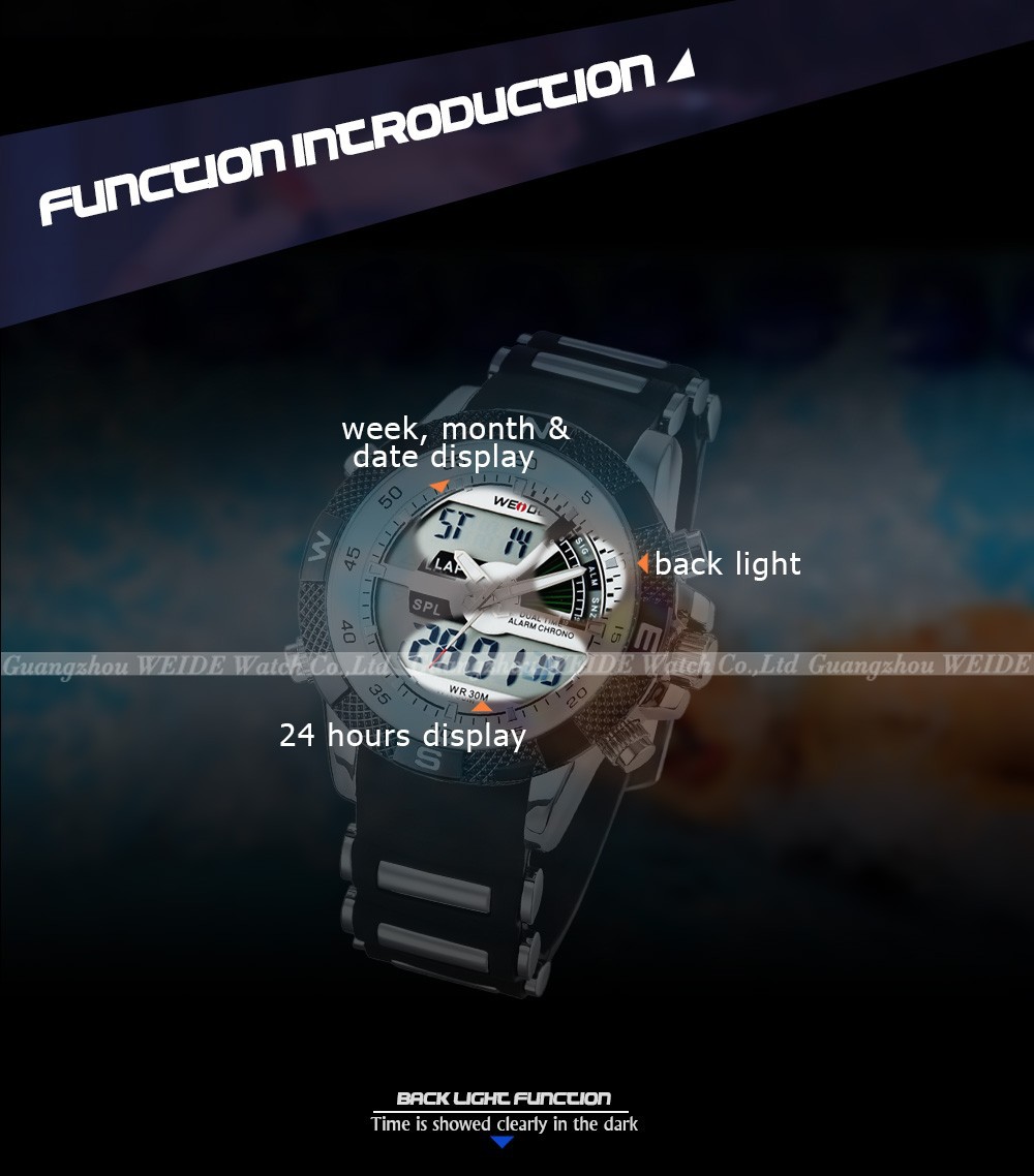 2013 Brand New WEIDE men LED Luminous analog digit dual time display Date Week Alarm luxury brand sport watch unique design 3ATM